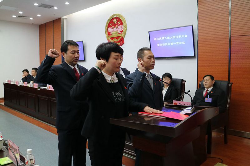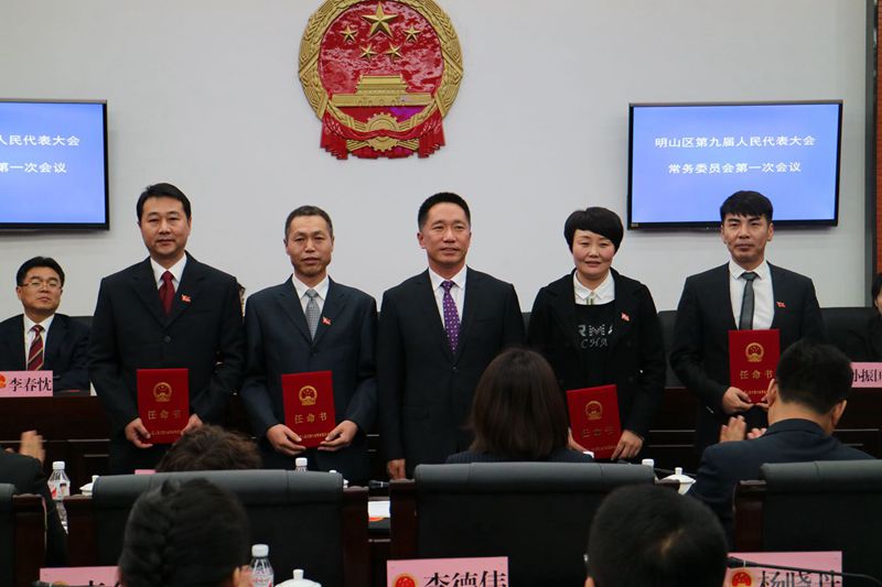区委常委、纪委书记、区监察委员会主任郑伟宣读了《关于谭霞等同志任职的议案》,并作说明。拟任命人员同常委会组成人员见面,并作拟任职表态发言。常委会满票表决通过,任命谭霞、郭巍2名同志为明山区监察委员会副主任,任命宋超杰、陈福平2名同志为明山区监察委员会委员。区人大常委会主任李海深向被任命人员颁发了任命书,随后,被任命人员依法进行宪法宣誓。